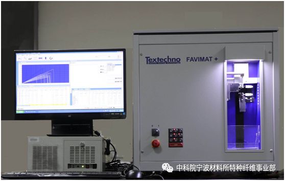 宁波材料所特种纤维事业部拥有德国FAVIMAT+型单丝纤维万能测试仪,该装置采用气动夹持,半自动测试的方式,其测力综合装置可以测定普通化纤、高强高模芳纶、高强高模聚乙烯、碳纤维、金属纤维、玻璃纤维、工程用短纤维等高性能纤维(拉伸强度、模量、断裂伸长率)力学性能。同时,还可利用振法测定纤维线密度,可直接显示线密度单值、平均值和变异系数。符合国家标准GB/T16256-1996、国际标准ISO1973-1995和国际化学纤维标准化局(BISFA)的试验方法标准,适用于单根纤维的线密度测定,可广泛应用于纤维、纺织等生产企业、检验机构和科研单位。