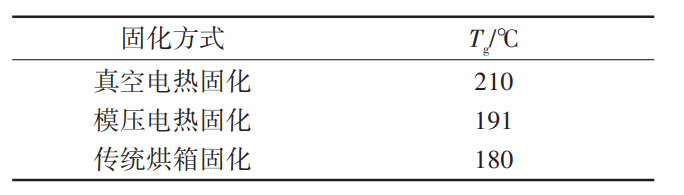 图6为不同固化工艺所得到CCF800H/EC120A复合材料层合板的DMA结果。选取储能模量的ONSET温度作为复合材料的玻璃化转化温度(Tg),如表1所示。真空电热固化复材板的Tg最高,约为210℃,表明其链段活动受限大。虽然传统烘箱固化的复材板Tg低,但在玻璃态时,随着温度的升高,传统烘箱固化所得复材板的储能模量几乎维持不变,而电热固化所得复材板的储能模量衰减较快。
