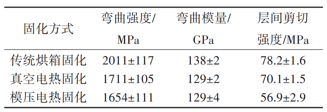 4)与传统烘箱固化方式相比,CNT膜真空电热固化的弯曲强度保持率为90%,弯曲模量相当,层剪性能差距较小。