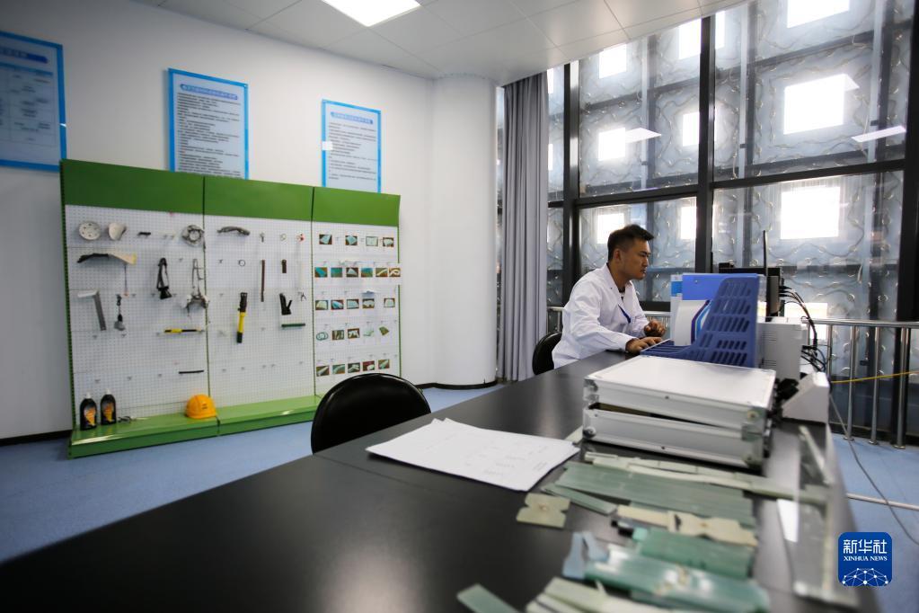 6月13日,工作人员在江苏射阳港零碳产业园的海上风电复合材料检测中心收集、分析测试数据。