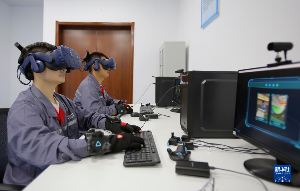 在江苏射阳港零碳产业园,工作人员在VR培训室进行模拟测试(6月13日摄)。