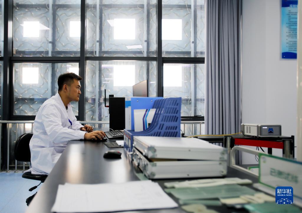 6月13日,在江苏射阳港零碳产业园,工作人员在海上风电复合材料检测中心收集、分析测试数据。