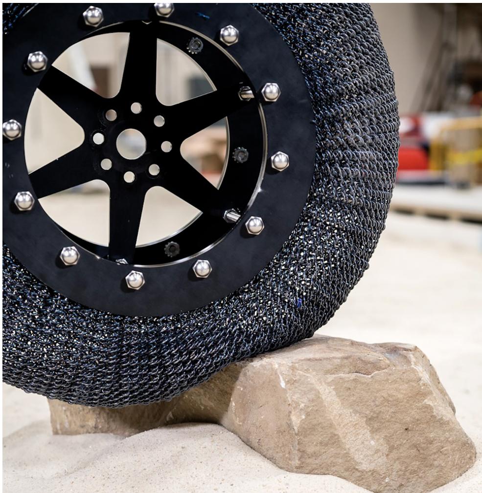 对于可以穿越多岩石、多尘的斜坡的地面车辆来说,形状记忆合金可以在无气轮胎中发挥重要作用,因为无气轮胎可以剧烈变形,但可以恢复其原始形状。通过将形状记忆合金制成的金属丝和弹簧联锁成一种特殊的双层图案来制造轮胎。