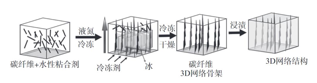 冻干取向法是通过控制垂直的温度梯度,使得冰垂直向上生长,从而使碳纤维沿着冰的方向垂直排列,并在粘合剂的作用下保持垂直方向的方法。通过冻干取向,碳纤维可以形成平行排列的取向结构,热量可以在取向结构中快速传递,从而可以获得较高的热导率。在传统方法中,并没有充分利用碳纤维作为一维导热材料在轴向具有较高导热性能的特点,冻干取向法是近年来发展起来的制备导热复合材料的一种有效方法,通过冷冻干燥,得到连通的碳纤维 3D 网络结构。