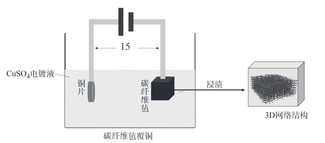 Xu 等通过电镀的方法,在碳纤维表面覆盖一层铜,制备了碳纤维 3D 网络结构增强环氧树脂导热复合材料。在碳纤维毡表面形成的铜膜网络形成连续的导热通路,将环氧树脂浸渍到镀铜的碳纤维毡上制得导热复合材料,其热导率达到 3.069 W/(m · K),与纯环氧树脂的热导率相比有明显提高。与浸涂、旋涂等传统喷涂相比,电泳沉积法可以快速沉积金属材料,并能有效控制碳纤维表面金属材料的厚度。图 2 是电泳沉积法制备碳纤维 3D 网络结构增强环氧树脂导热复合材料示意图。