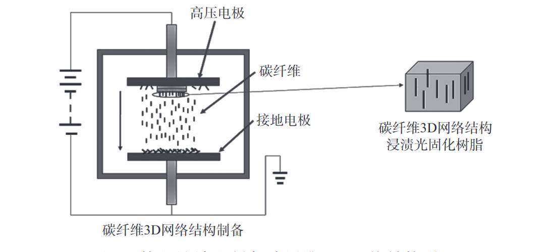 图 3 静电植绒法制备碳纤维 3D 网络结构增强 光固化树脂导热复合材料示意图
