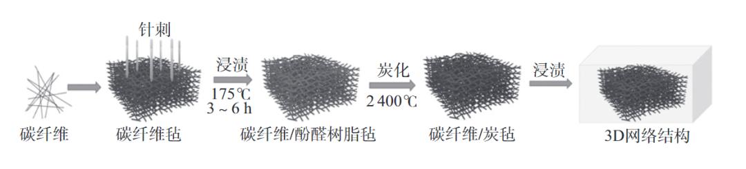 气流成网 - 针刺成毡法是指通过气流网络技术,以碳纤维为原料,制成多层碳纤维软垫,采用数组针对碳纤维软垫进行针刺,而后压缩,浸渍树脂,并炭化来制备碳纤维 3D 网络结构的一种方法。在压缩过程中,X-Y 平面上的少量碳纤维会转移至 Z 方向,增强了层间碳纤维的结合力。通过烧结, 不同层间的树脂变为残炭,将不同层间的碳纤维连接在一起,制得碳纤维 3D 网络结构,从而形成高导热通路,通过浸渍基体树脂,获得碳纤维 3D 网络结构导热复合材料。