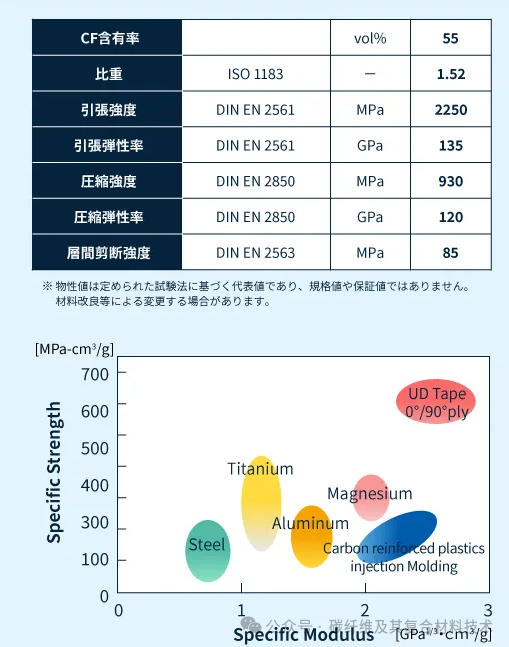 日本旭化成公司一直致力于开发热塑性树脂基复合材料,从而实现金属结构件的替代化解决方案。目前,旭化成公司已经成功开发出一种单向连续纤维增强热塑性胶带(Uni- Directional Tape,UD Tape),它是由单向编织碳纤维增强聚酰胺树脂形成的一种胶带状材料。这种碳纤维热塑性单向带具有优异的比强度、比刚度等机械特性(如下图所示),使其非常适合在各种产品中用作金属零部件的替代品,包括汽车部件、电气电子部件、飞机部件、体育用品以及建筑材料等,可减轻产品重量,并减少产品使用和运输过程中的温室气体排放。