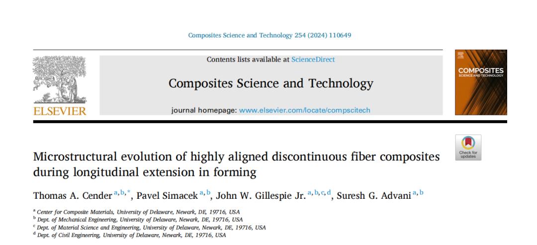 Cender, T. A., Simacek, P., Gillespie, J. W. Jr., & Advani, S. G. (2024). Microstructural evolution of highly aligned discontinuous fiber composites during longitudinal extension in forming. Composites Science and Technology, 254, 110649.