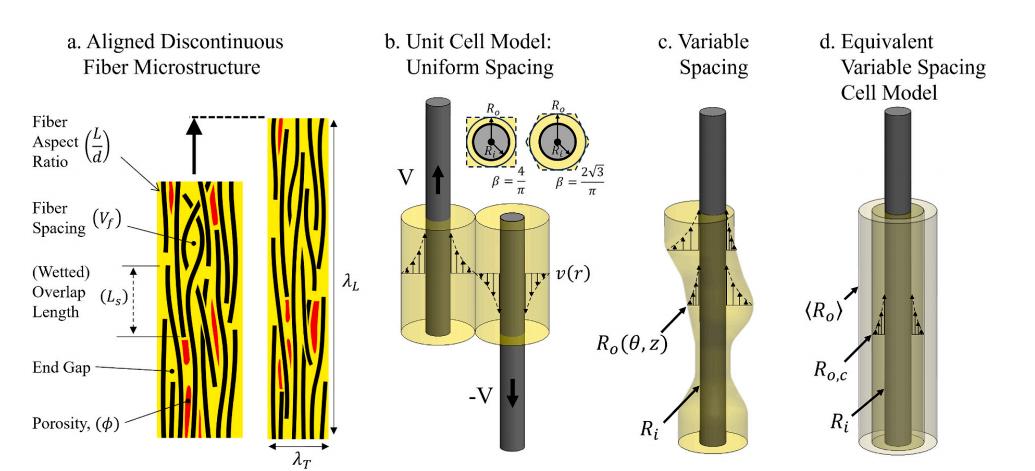 图 1. (a) ADF 微观结构。(b) 间距均匀的同心晶胞剪切模型,纤维重叠长度减小,纵向变形。(c) 单根纤维周围的纤维间距变化。(d) 考虑间距变化的等效同心晶胞模型。