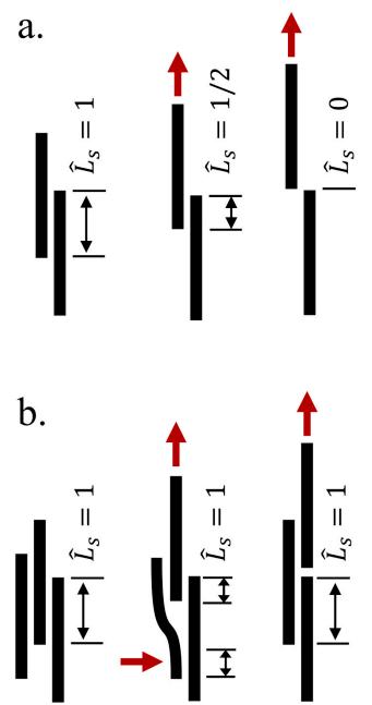 图 2. (a) 重叠处纤维剪切长度随变形而减少。(b) 重叠长度面积增加时纤维剪切。