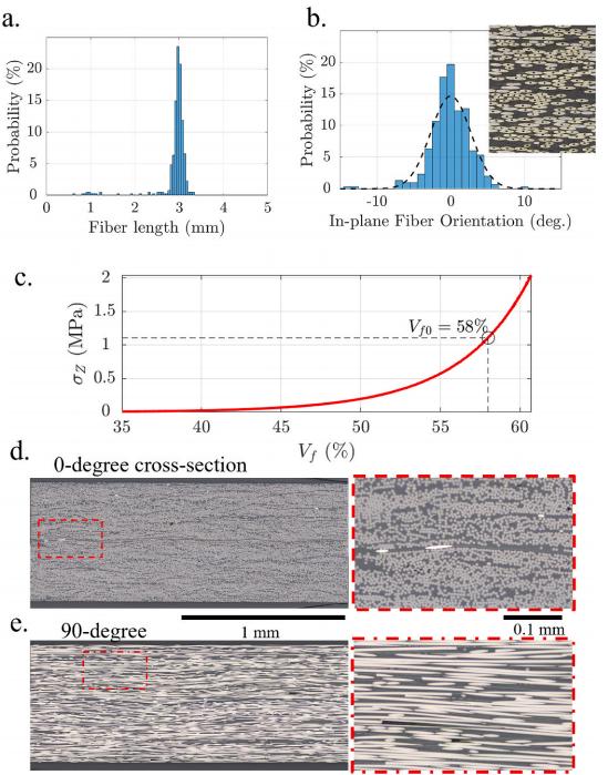 图 3. 初始微观结构质量评估(a)纤维长度分布(b)纤维取向分布(c)干纤维层压响应 [21]。全固结(初始孔隙率可忽略)[0]6 层压板的材料横截面(全层压板厚度)和子截面显示在(d)0 度方向和(e)90 度方向。
