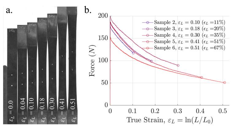 使用万能试验机在恒定温度和真实应变率条件下拉伸样品1至6,记录了每个样品的力-应变曲线。力在低应变时达到峰值,随后随着应变的增加表现出应变软化行为。