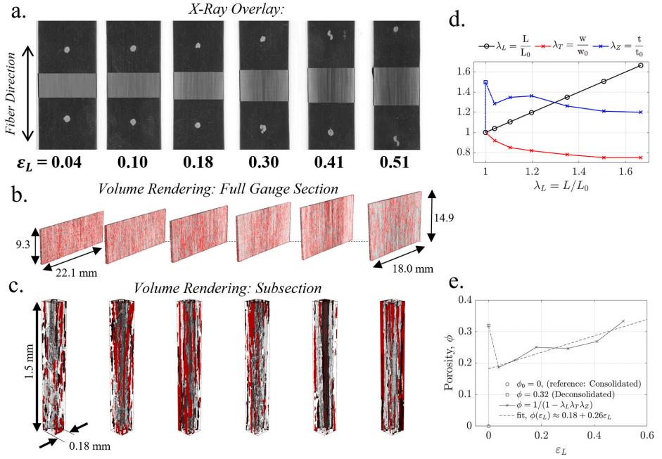 图 6. 样品 1-6 的全规格截面的 X 射线微 CT,(a) 样品上叠加了 X 射线透射图。(b) 全规格截面体积渲染,纤维和树脂以半透明灰度显示,孔隙度以红色显示。(c) 子截面显示孔隙度的分布。(d) 报告显示样品尺寸变化表明 (e) 体积增加,这对应于孔隙度的增加。
