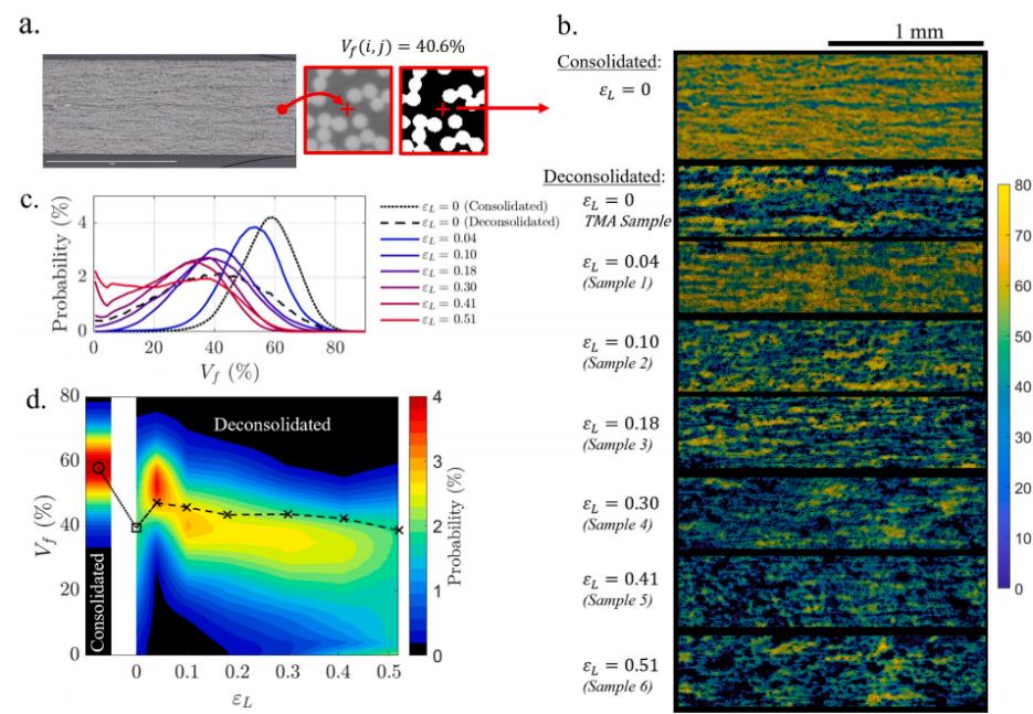 图 7. (a) 使用移动窗口分析局部纤维体积分数的最佳显微照片。(b) 叠加在样品显微照片上的局部纤维体积分数。(c–d) 纤维体积分数分布演变。